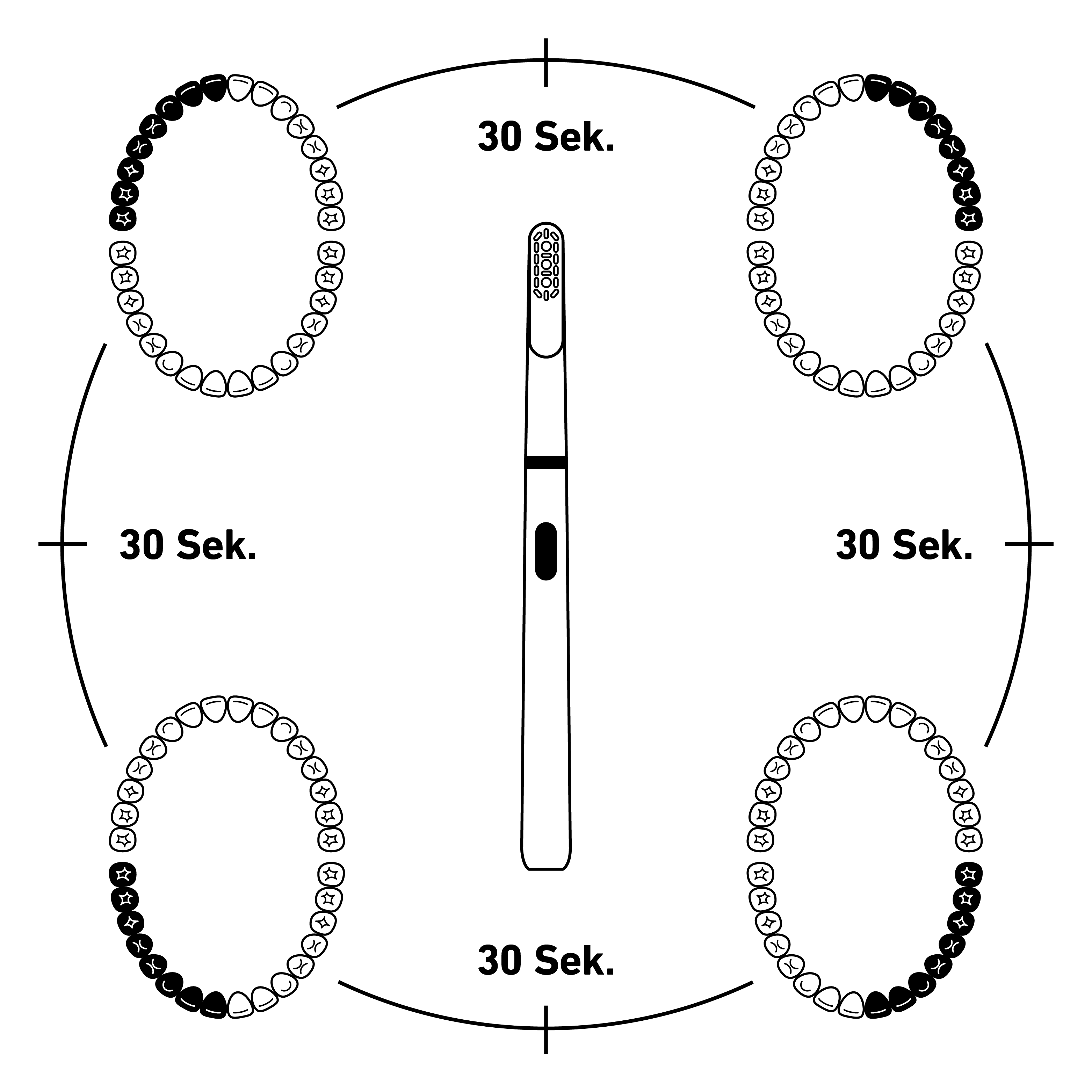 Er begleitet Dich sanft durch eine 2-minütige Putzsitzung, 30 Sekunden für jeden Quadranten Deiner Zähne.