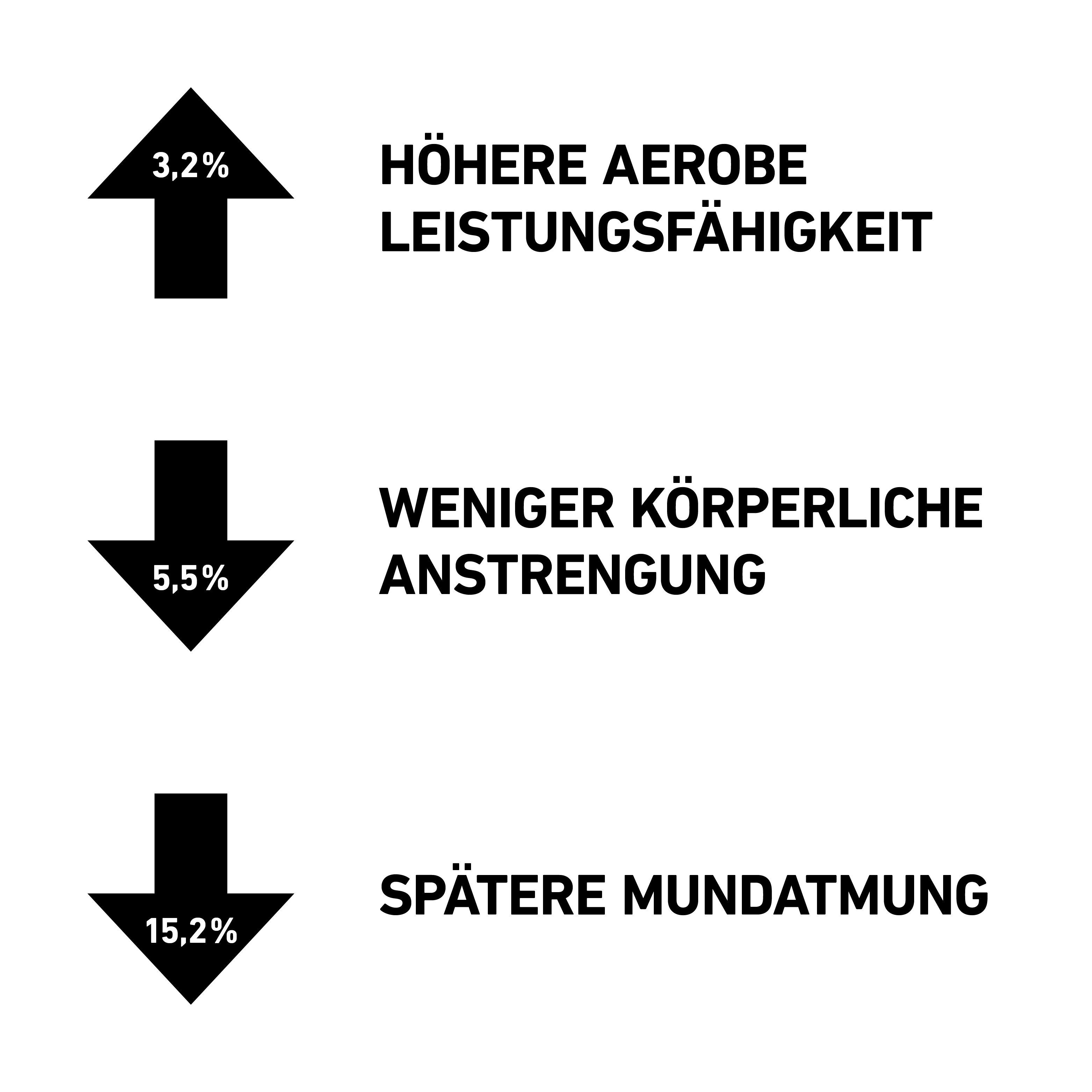 Studien zeigen, dass Nasentapes Deine maximale Sauerstoffaufnahme erhöhen und die wahrgenommene Anstrengung beim Training verringern. Ausserdem wurde gezeigt, dass Deine aerobe Leistungsfähigkeit um 3,2% steigen und die körperliche Anstrengung um 5,5% sinken kann. Auch kann die Mundatmung beim Sport erwiesenermassen um 15,2% verzögert werden.